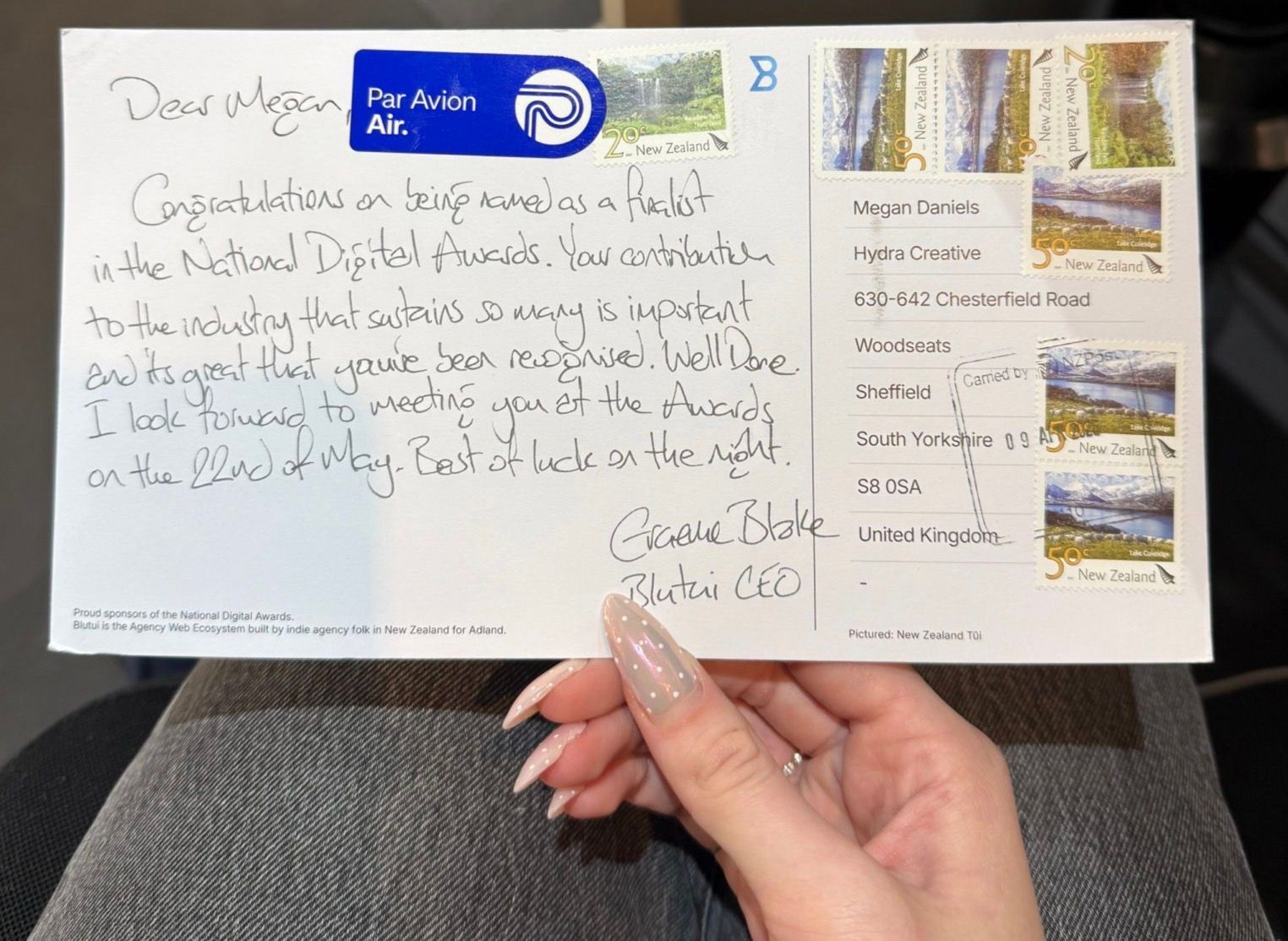 Every finalist received a postcard sent from New Zealand.